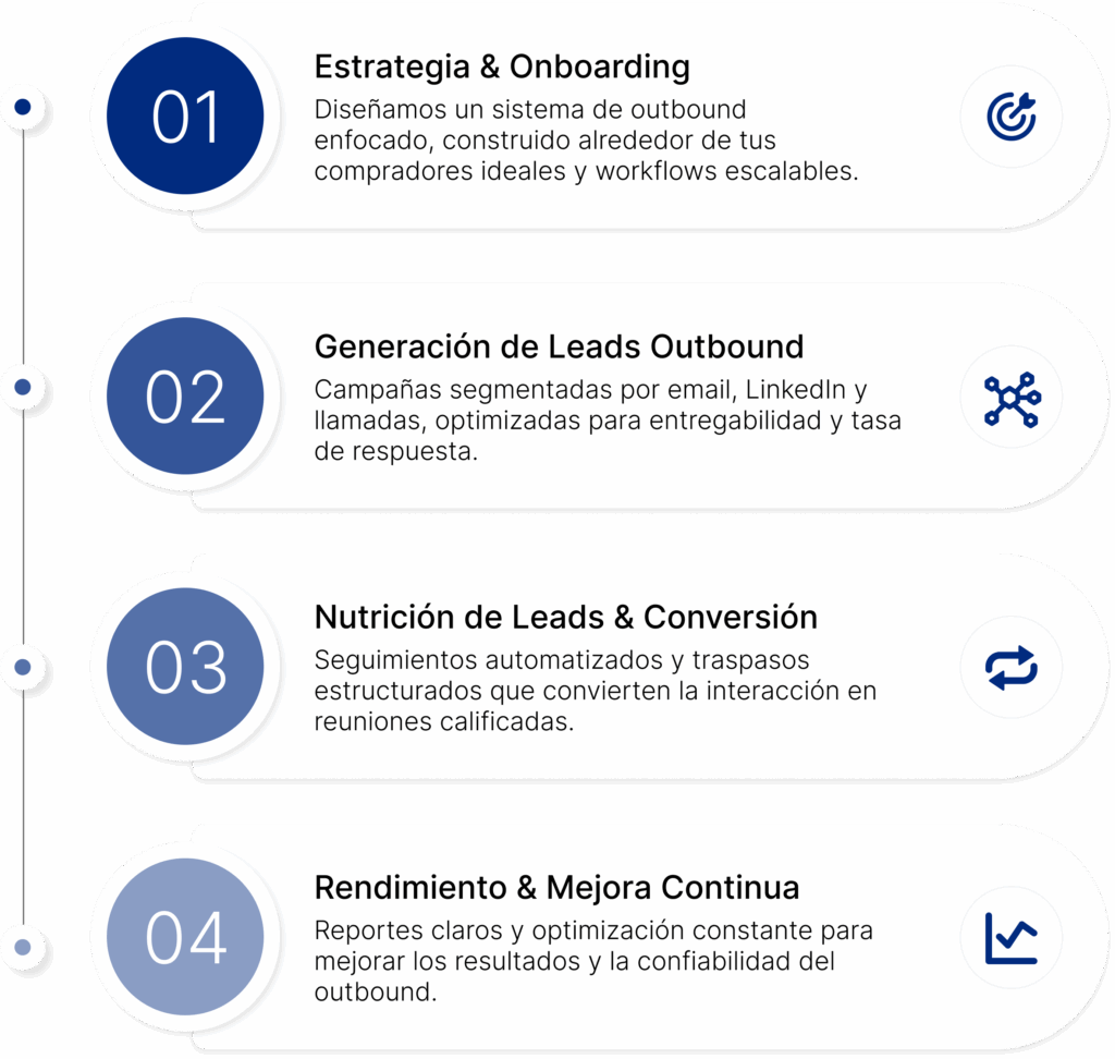 Seguimos un proceso simple y estructurado que te lleva desde la estrategia hasta reuniones agendadas y un impacto medible en los ingresos.