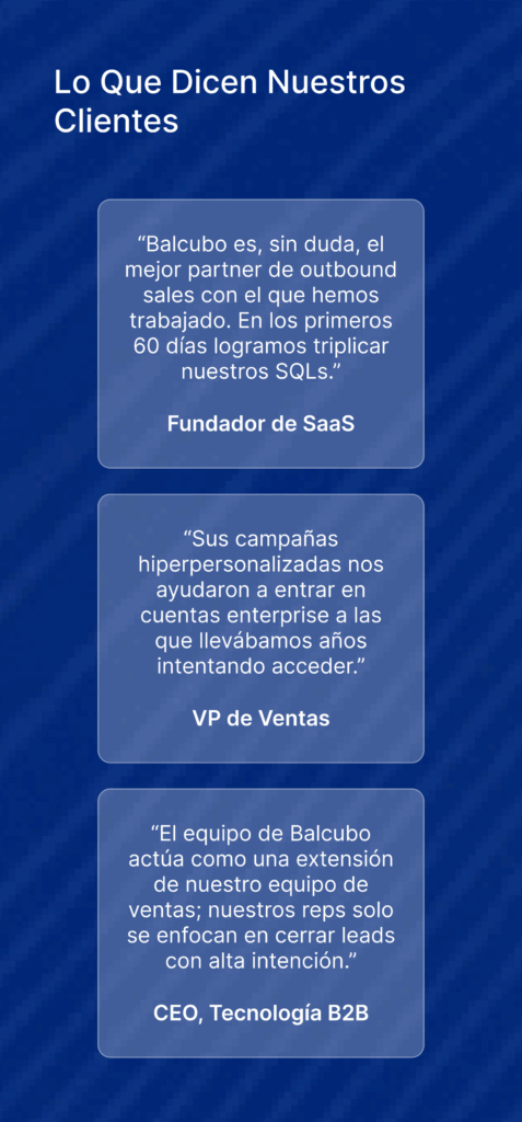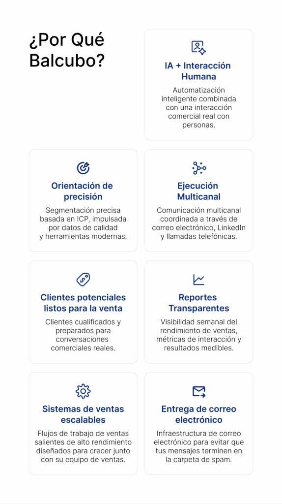 Balcubo te ayuda a llegar a los clientes potenciales correctos mediante estrategias de outbound precisas, generación inteligente de leads y una interacción humana real.